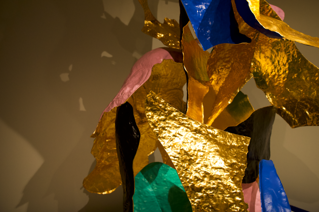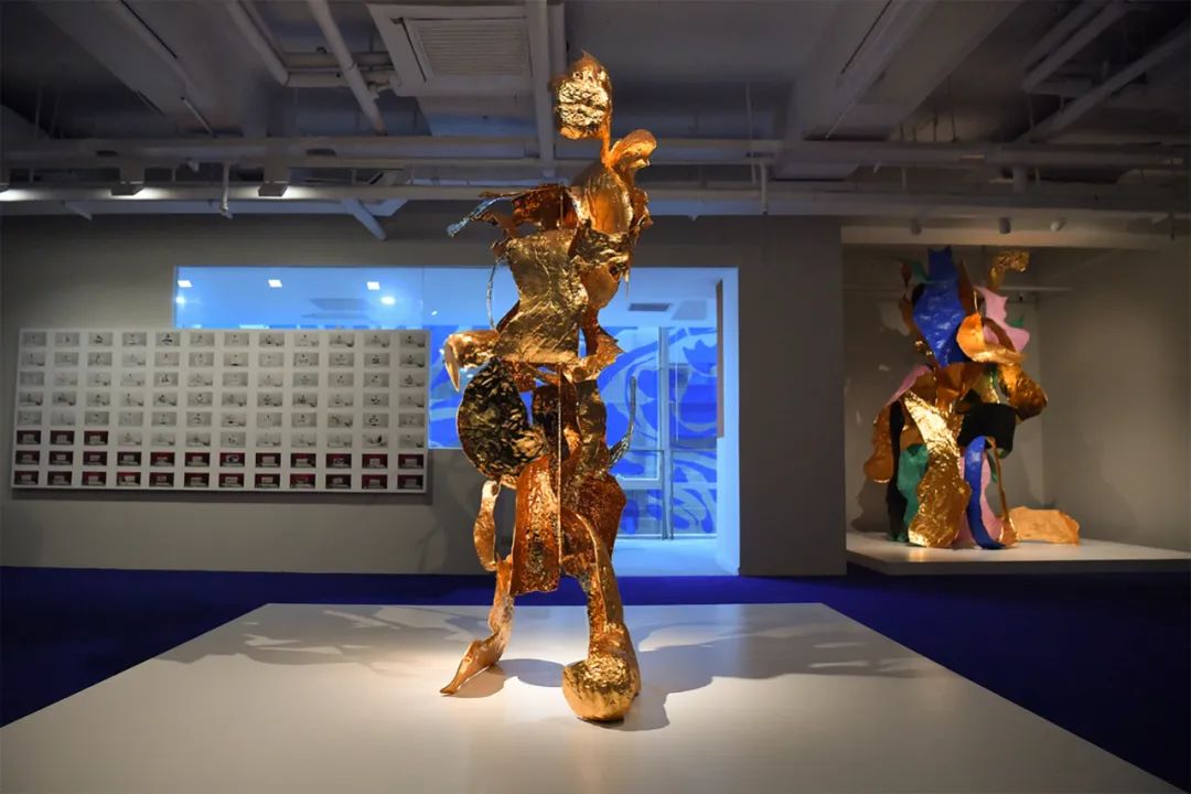 (左)《开壳——伏虎》,不锈钢、⾦箔、电镀、烤漆,82x240x130cm,2023年©邬建安